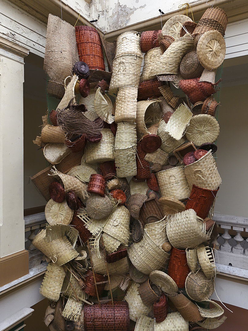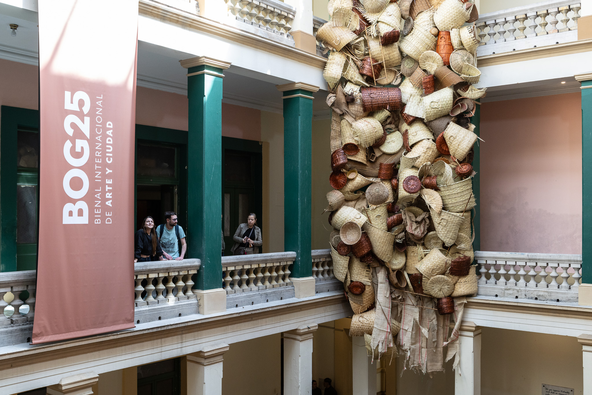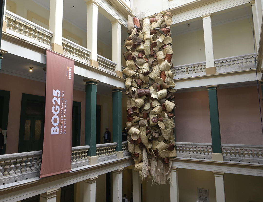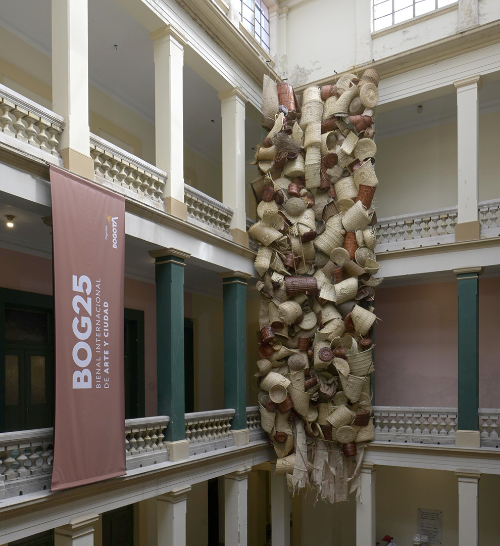 Estudio artesanal para una deconstrucción moderna, obra comisionada por BOG25, consiste en un enorme tejido realizado con cestas compradas en mercados públicos. “La cestería nos remite a un origen simbólico, a un lugar donde ciertas tradiciones aún persisten y nos hablan de lo que fuimos. Cuando encuentro una cesta de fibras naturales deteriorada, tirada sobre el cemento gris de la ciudad —incapaz de descomponerse como lo haría en su entorno natural—, me enfrento a una imagen potente del conflicto: el ciclo vital de la materia interrumpido por el progreso urbano. Es en esa tensión donde nace este proyecto. Este trabajo propone una reflexión formal y material: maximizar los tejidos naturales de la cestería a materiales sobre el concreto y así dejar en evidencia la oposición binaria, el contraste entre dos tipos de mundos que aún coexisten en pugna. Busco explorar cómo esa “ruralidad persistente” se filtra dentro de lo urbano, del concreto y de lo civilizado. Así como en los bordes periféricos de muchas ciudades latinoamericanas conviven sin límites claros estos dos mundos —el rural y el urbanizado—.