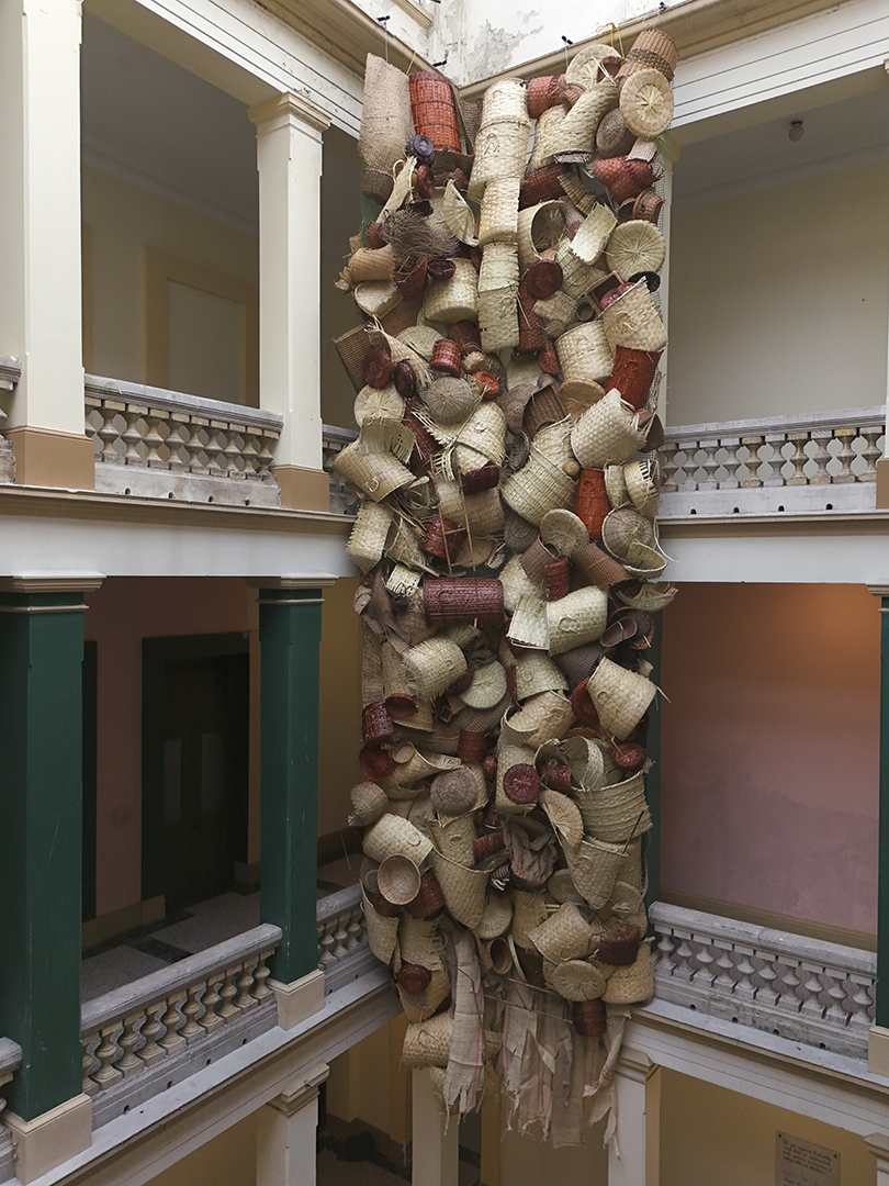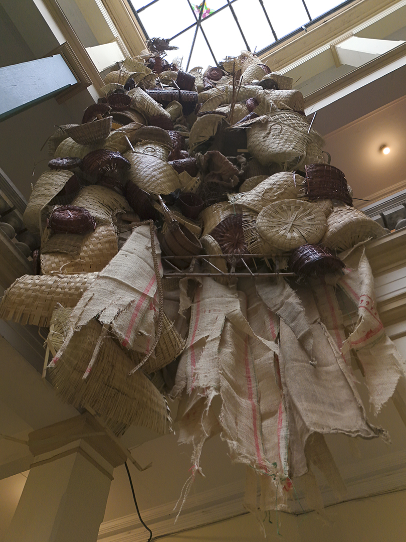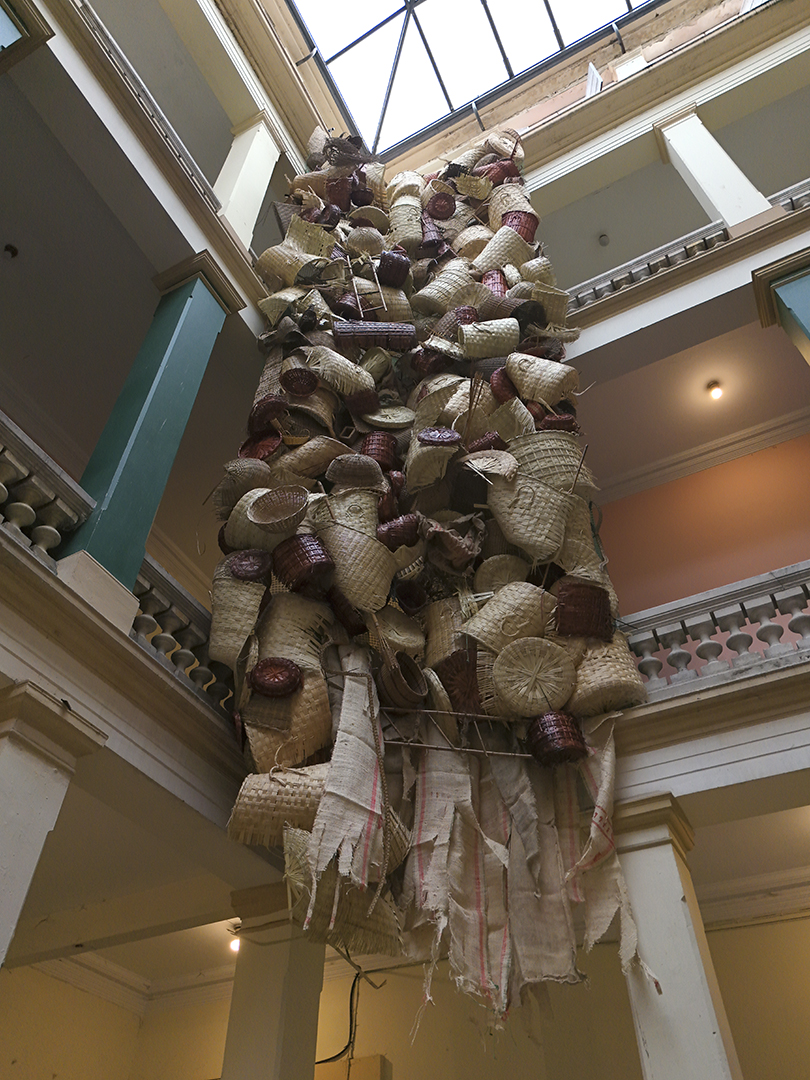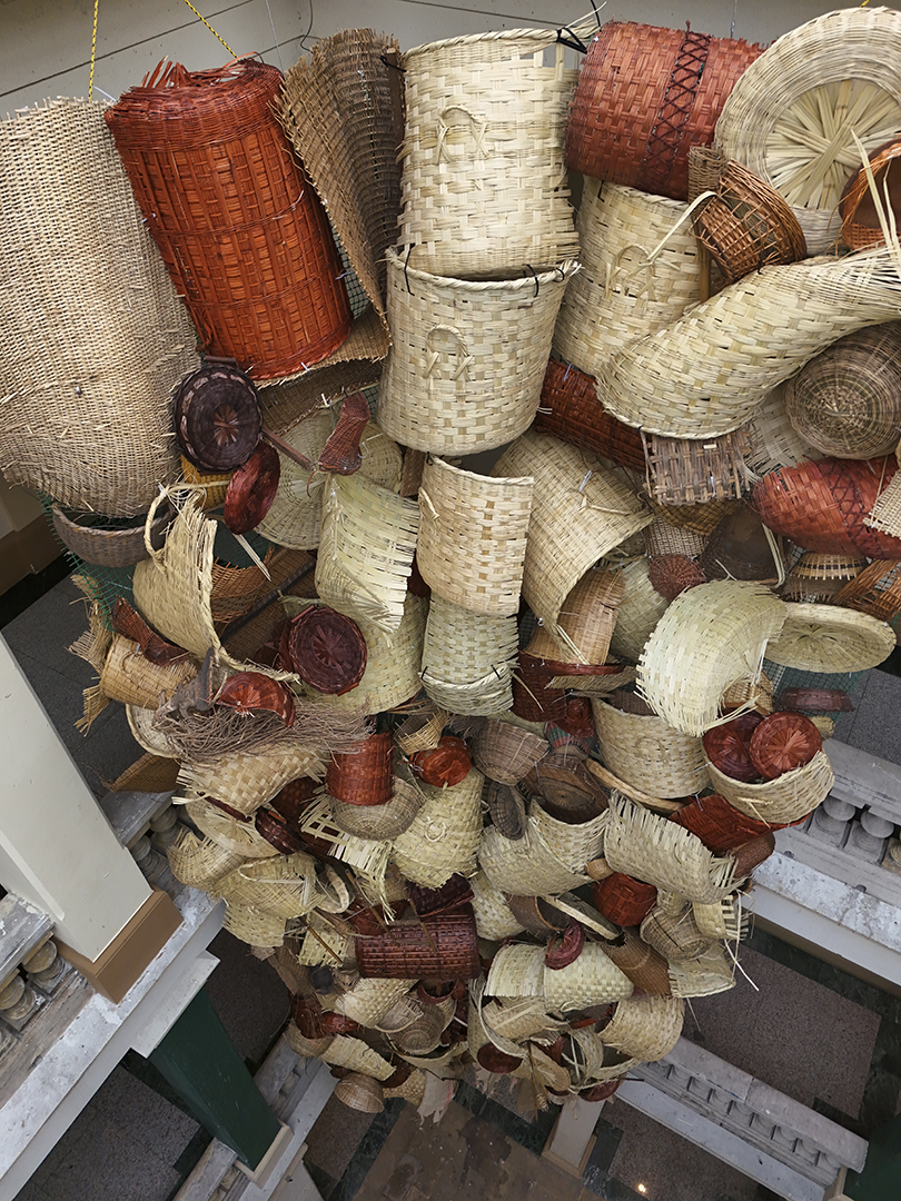 Estudio artesanal para una deconstrucción moderna, obra comisionada por BOG25, consiste en un enorme tejido realizado con cestas compradas en mercados públicos. “La cestería nos remite a un origen simbólico, a un lugar donde ciertas tradiciones aún persisten y nos hablan de lo que fuimos. Cuando encuentro una cesta de fibras naturales deteriorada, tirada sobre el cemento gris de la ciudad —incapaz de descomponerse como lo haría en su entorno natural—, me enfrento a una imagen potente del conflicto: el ciclo vital de la materia interrumpido por el progreso urbano. Es en esa tensión donde nace este proyecto. Este trabajo propone una reflexión formal y material: maximizar los tejidos naturales de la cestería a materiales sobre el concreto y así dejar en evidencia la oposición binaria, el contraste entre dos tipos de mundos que aún coexisten en pugna. Busco explorar cómo esa “ruralidad persistente” se filtra dentro de lo urbano, del concreto y de lo civilizado. Así como en los bordes periféricos de muchas ciudades latinoamericanas conviven sin límites claros estos dos mundos —el rural y el urbanizado—.